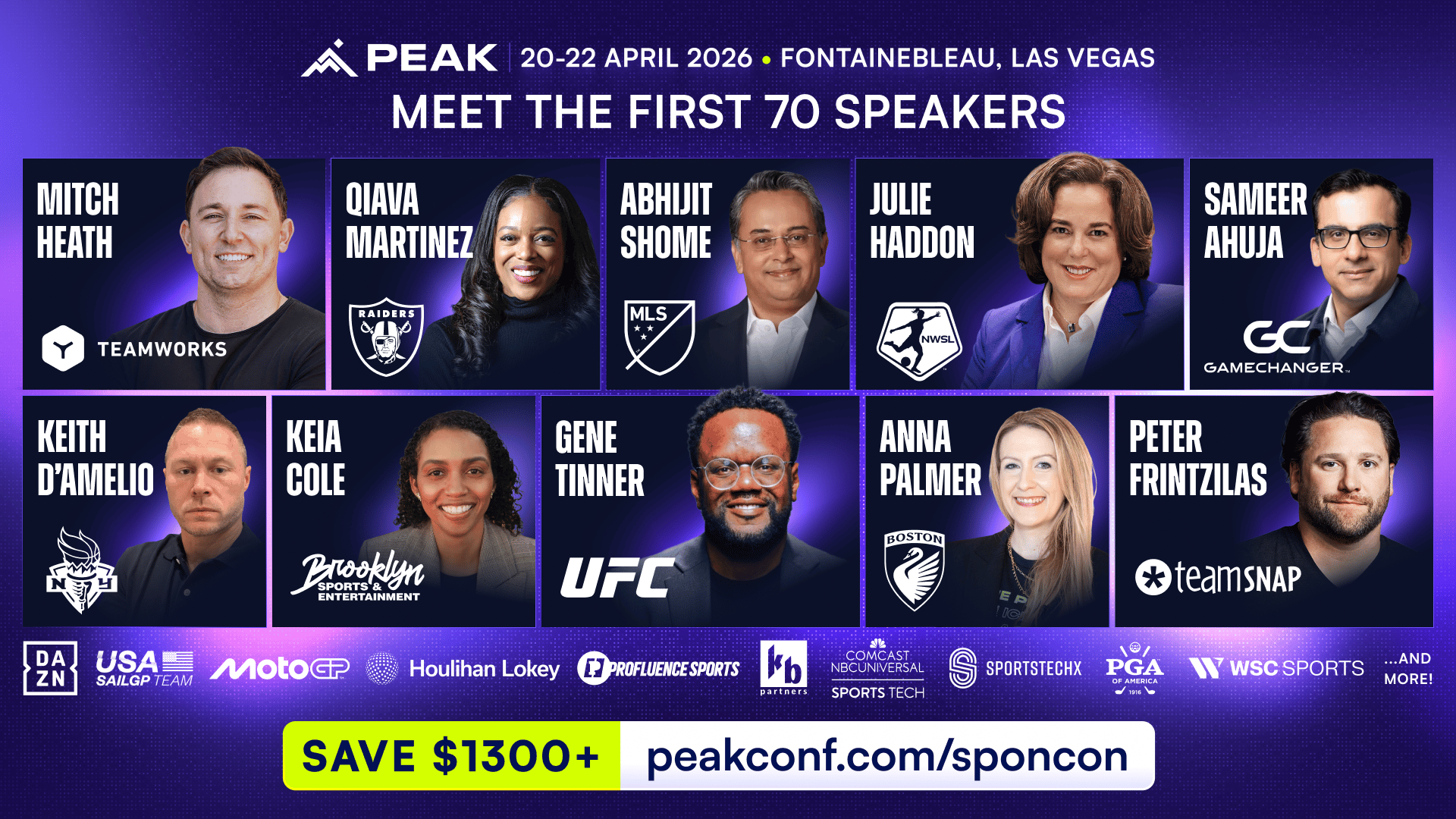 PEAK brings together 1,000+ sports executives, founders, and investors shaping the future of sport. Leaders from the Raiders, UFC, MLS, WTA, and more will be there alongside 100+ SportsTech companies, including NBA Launchpad startups, Hudl, Lenovo, TeamSnap, Pixellot, and others.