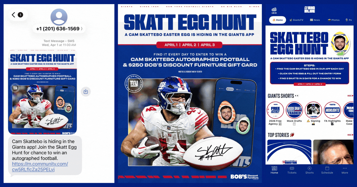 Ahead of Easter weekend (April 1â3), they launched a Cam Skattebo Egg Hunt inside their mobile app, presented by Bobâs Discount Furniture. Each day, a hidden egg was placed somewhere inside the app.