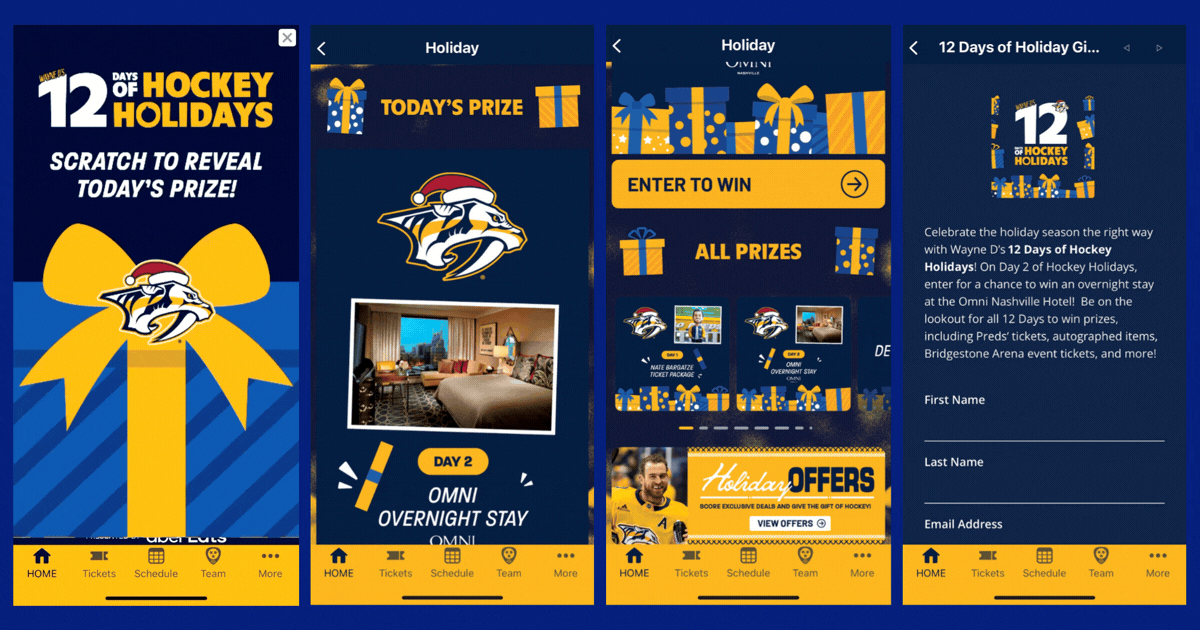 They ran a â12 Days of Hockey Holidaysâ promotion inside their app, where a scratch-off game appeared as soon as you opened it. Each day unlocked a new prize, and entering required submitting your information.